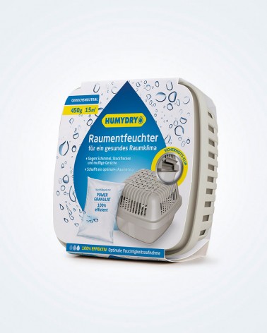 Der HUMYDRY Luftentfeuchter Smart 450g schützt Ihre Wohnung und Ihr Eigentum vor zu hoher Luftfeuchtigkeit und verhindert somit die Entstehung von Schimmel, Kondensation und modrigen Gerüchen.