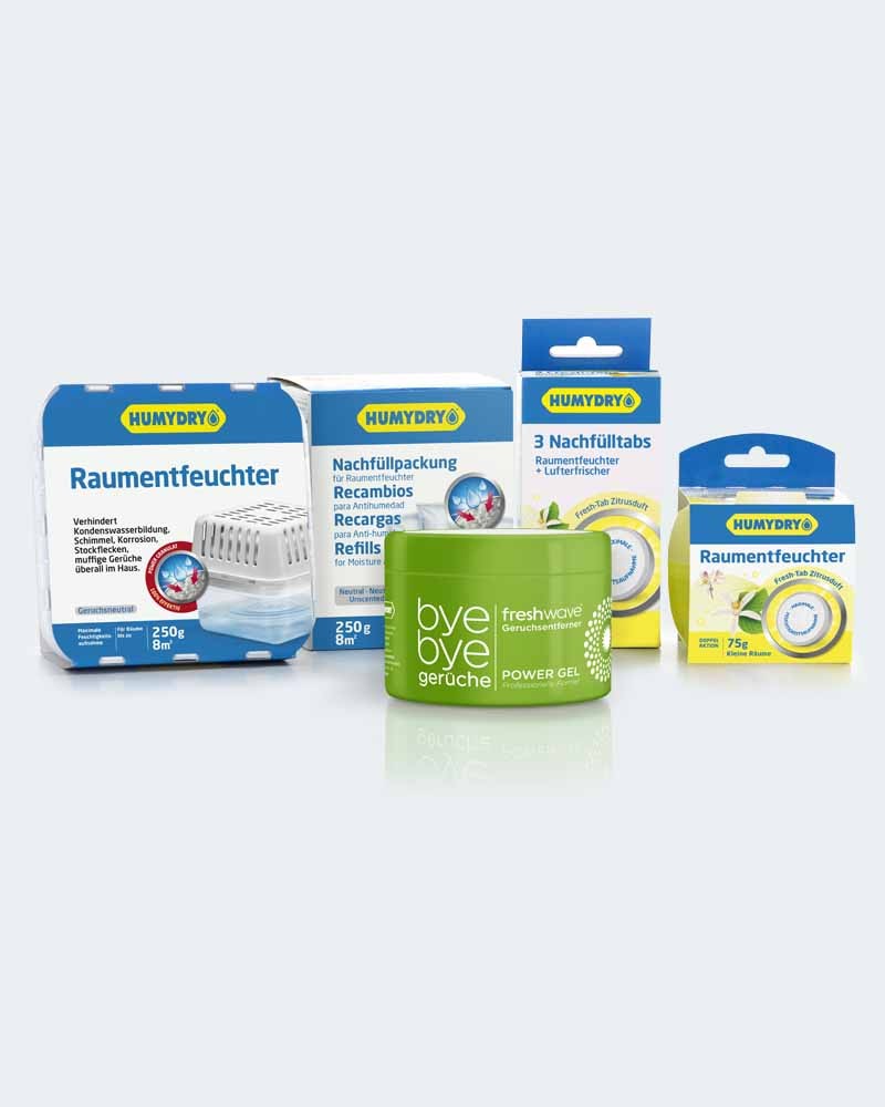Dieses Sonder-Sets, dass speziell zur Beseitigung von Feuchtigkeit und unangenehmen Gerüchen im Badezimmer entwickelt wurde, enthält:
