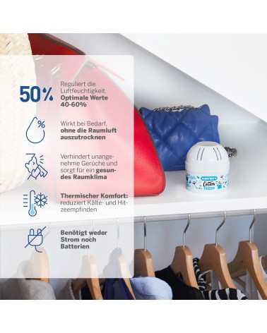 - Luftentfeuchter mit Granulat: Absorbiert überschüssige Feuchtigkeit zuverlässig und setzt dabei einen angenehmen Duft frei.