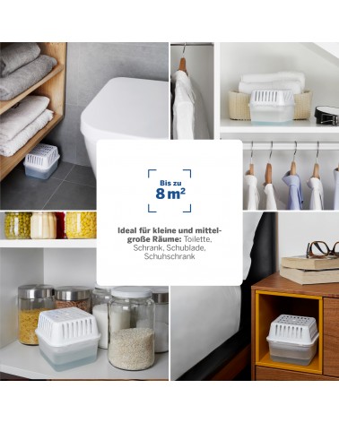 Der HUMYDRY® Compact 250g ist optimal für Räume bis 20 m³ (ca. 8 m²) geeignet. Typische Einsatzorte sind Badezimmer, Vorratsräume, Abstellkammern, Kleiderschränke, Hochschränke oder kleine Büros.