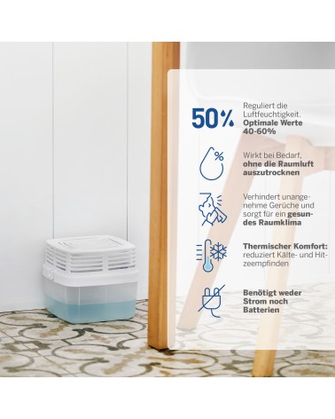 Der HUMYDRY® Luftentfeuchter Premium 450g schützt zuverlässig vor den Folgen von zu hoher Luftfeuchtigkeit. Er absorbiert überschüssige Feuchtigkeit, bis die optimale Luftfeuchtigkeit von 40–60% erreicht ist, und sorgt so für ein gesundes und angenehmes Raumklima.