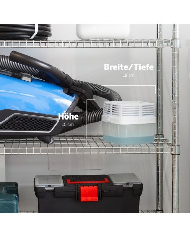 - Hohe Leistung: Das wirksame Granulat bindet überschüssige Feuchtigkeit und verwandelt sie in Flüssigkeit, die sicher im Auffangbehälter gesammelt wird.
