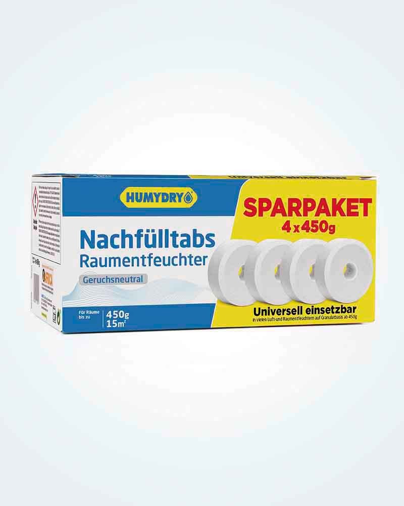 Inhalt: 4x450g HUMYDRY® Raumentfeuchter-Nachfülltabletten mit Loch